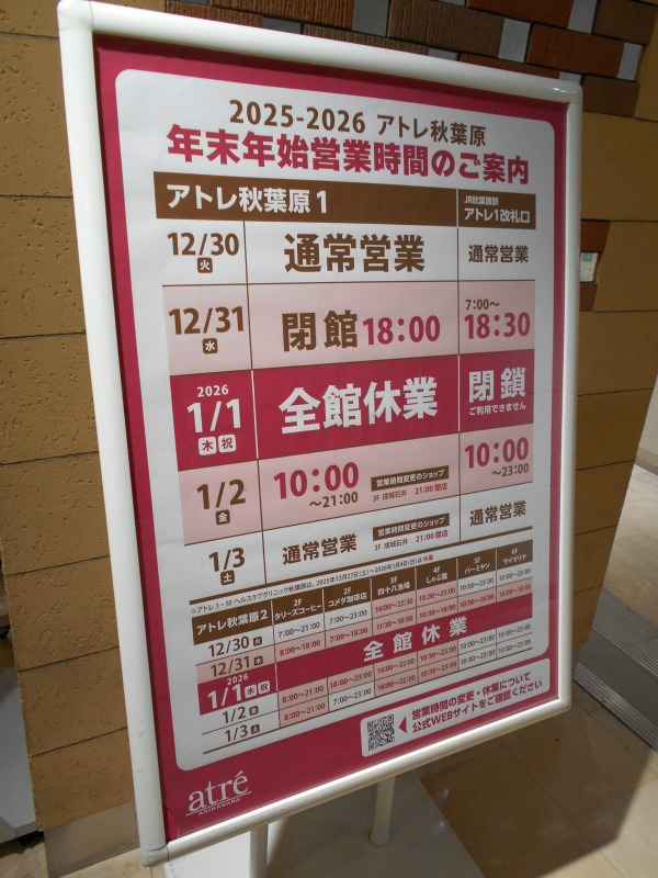 どうも今日は。毎度の事ながら土曜の昼過ぎに秋葉原へ来ています。それでいつもの通りアトレ1改札口から秋葉原入りしたんですが、 最初に見たのがこの告知、年末年始の営業時間の案内です。まあ毎年ほぼ同じ内容なんですが来年の元旦も全館休業ね。 これも毎年恒例だなあ。ただ元旦から初詣とかで動く人には要注意。