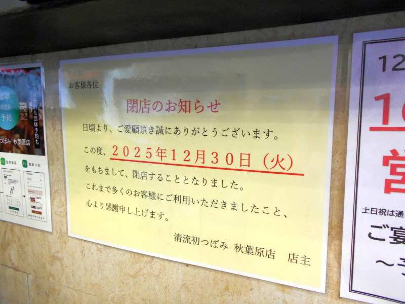 駅前にあるブックオフの上には清流 初つぼみという日本料理の店があるのですが、ビルの入口に今年の12/30を以て閉店するとの告知が掲示されました。 ここランチで稲庭うどんが食べられる貴重な店だったんだけどな。 一度、食べに行こうとしたけど団体客で満席とか言われて敢えなく離脱したのを思い出した。無念。